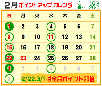 毎月その月のセール開催日とポイントデーのお知らせカレンダーを更新しています。ぜひお得な日をチェックして、お買い物にいらしてください。